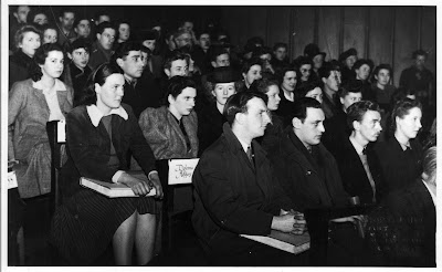 lecture room, sitting tightly packed on tiers of seating, each graduate taking